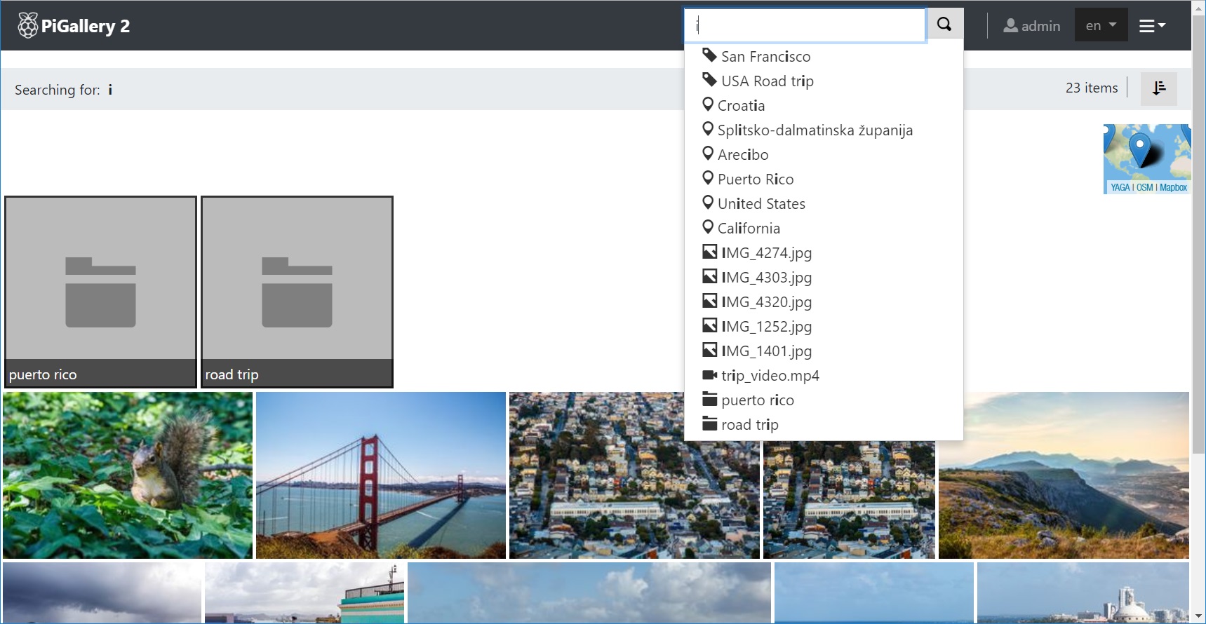 PiGallery2 reads the location data of the photos and puts them on a nice map. The gallery also supports *.gps file to show your tracked path on the map too. It by default supports OpenStreetMap and Mapbox, but you can also add you own favourite map provider.Searching