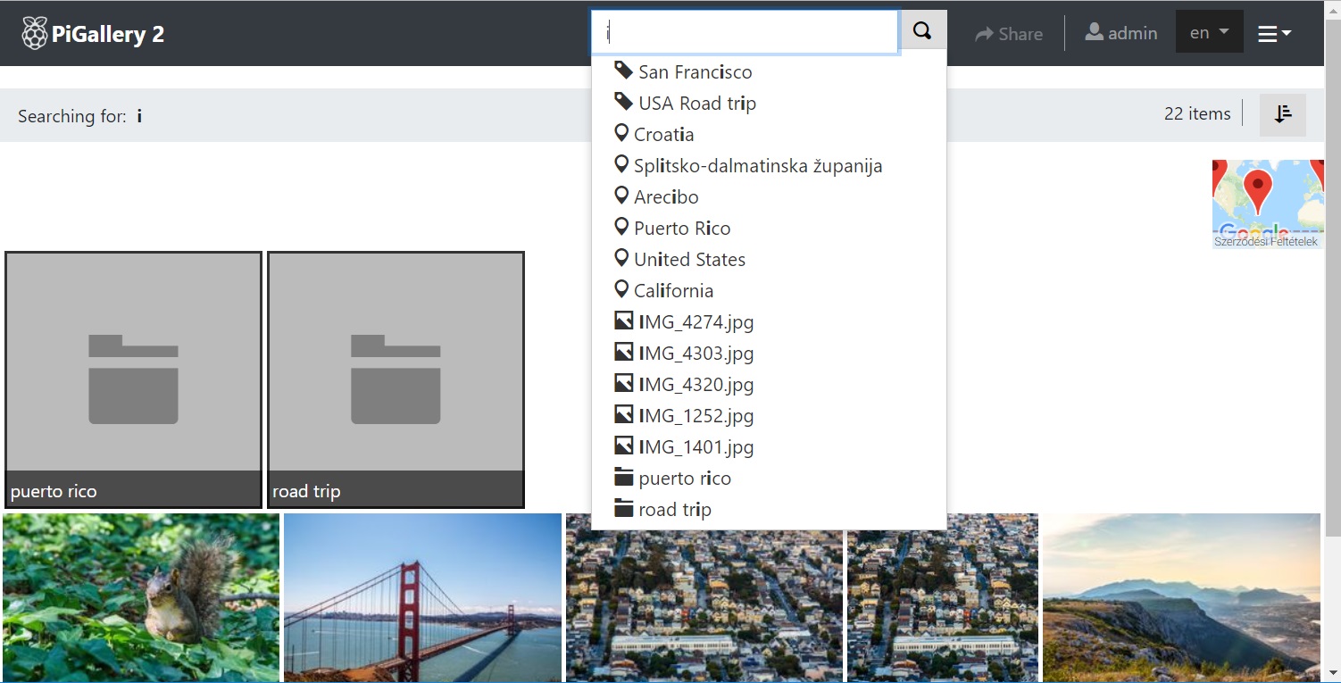 PiGallery2 reads the location data of the photos and puts them on google maps. The gallery also supports *.gps file to show your tracked path on the map too.Searching