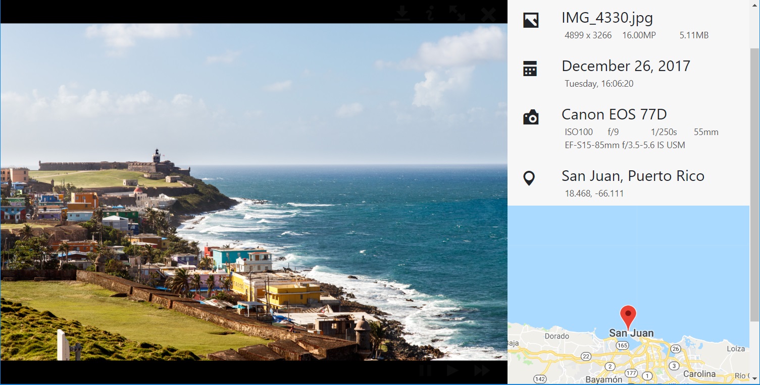 Nice photo viewer with optional information panel that shows all important information about the photo.