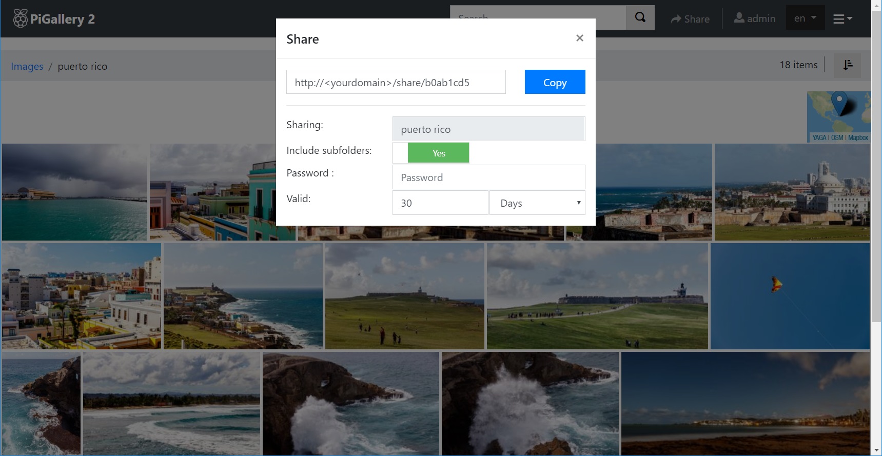 PiGallery2 reads the location data of the photos and puts them on a nice map. The gallery also supports *.gps file to show your tracked path on the map too. It by default supports OpenStreetMap and Mapbox, but you can also add you own favourite map provider.Searching